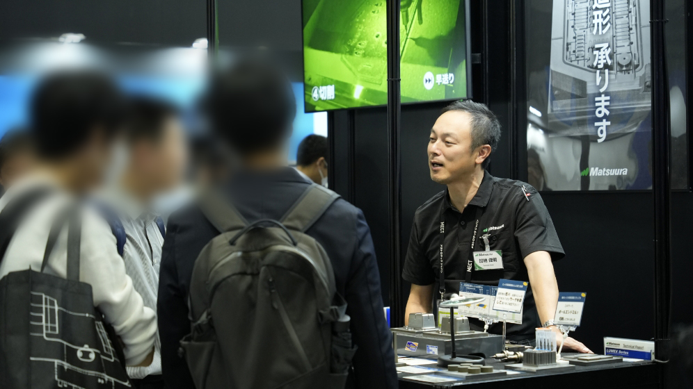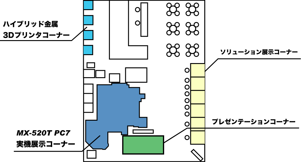 BOOTH マツウラブース図 MACHINE 実機展示コーナー arrow-left arrow-right SOLUTION ソリューション展示コーナー arrow-left arrow-right MACHINE ハイブリッド金属3Dプリンタコーナー arrow-left arrow-right PRESENTATION プレゼンテーションコーナー